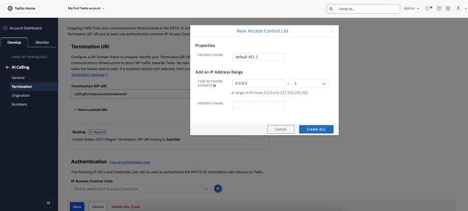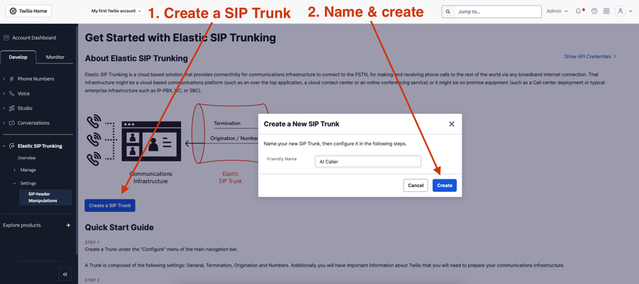 6. Click on “Create a SIP Trunk”, then give it a name - I just called mine “AI Calling”. Then create: