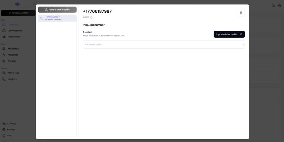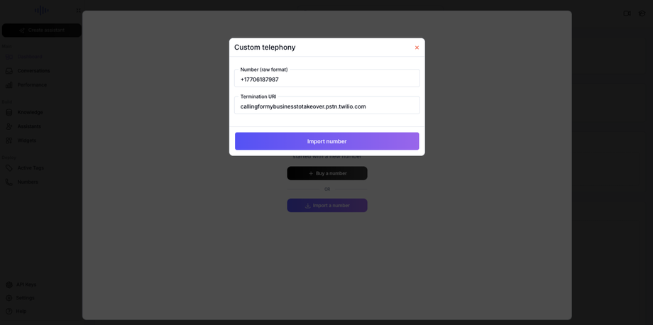 3. Then you are good to sync it with your assistants and make outbound calls / receive inbound calls for the AI to pick up from that number. We will save your termination URI for you so you don’t have to remember it everytime, just bring the number over.
