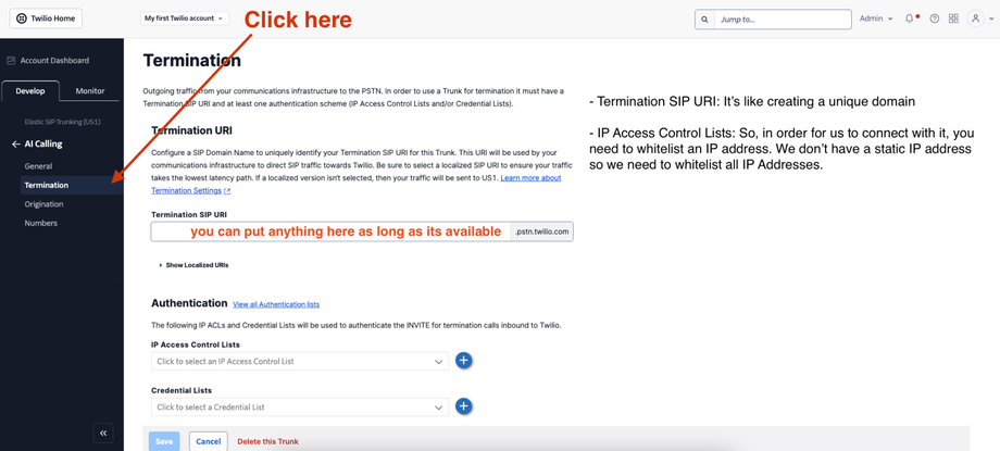 8. Stay with me here. If you got this far, you’re doing good. It’s about to get a little fun though so just take a breather and let's do this. Ok, so now we need to set up termination (this is for outbound). Click on Termination over on the navigation menu to the far left (in screenshot). The termination SIP URI here is like… really important. We would use it in later steps so save this for later: