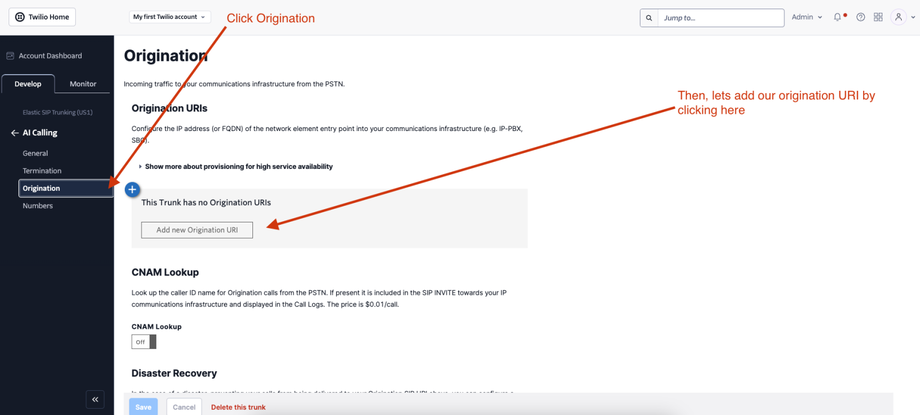 10. We are in the final inning! Ok, now - to set up inbound automation, (after saving your work) we need to go to Origination right underneath where we clicked on Termination. We just need to add a link here. Cool? Add a new Origination URI, add our origination URI and good to go: