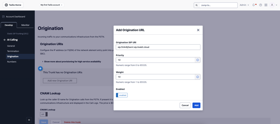 Origination URI (For you to copy): sip:5t4n6j0wnrl.sip.livekit.cloud