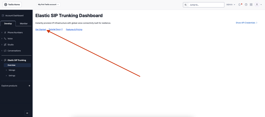 5. Now, we should be at the “Elastic SIP Trunking Dashboard”. We are getting close - hang in there. Ok, so now click “Get Started” right under the main header on this page: